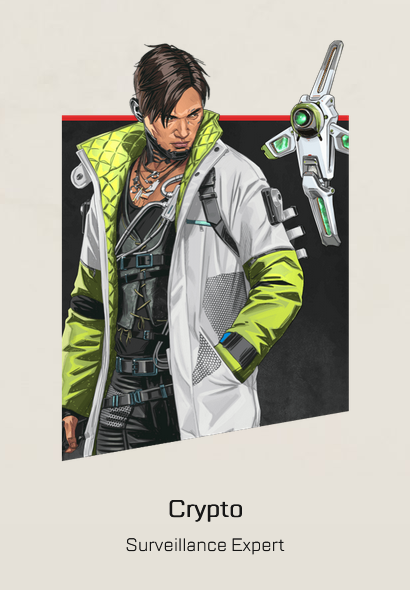 Crypto is a recon legend that can play as a supporting character in certain situations due to the vital intel that he can share with his teammates and is also relatively harder to master. His tactical Surveillance Drone allows him to deploy a drone that scans the surroundings for enemies. His passive, Neurolink makes all scanned enemies visible to his teammates.